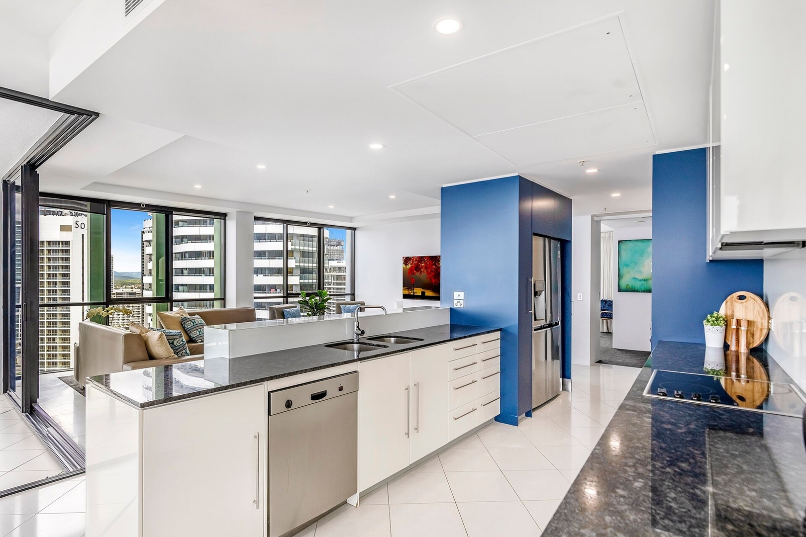 This is set up just like a home away from home. The apartment is designed for relaxed living, with an open-plan lounge and dining area that’s ideal for unwinding after a day at the beach or exploring the city. The fully equipped kitchen has everything you need to cook up a feast, and the large private balcony is the ideal spot for morning coffee or evening drinks while taking in the stunning ocean views.