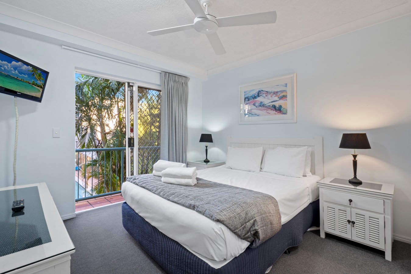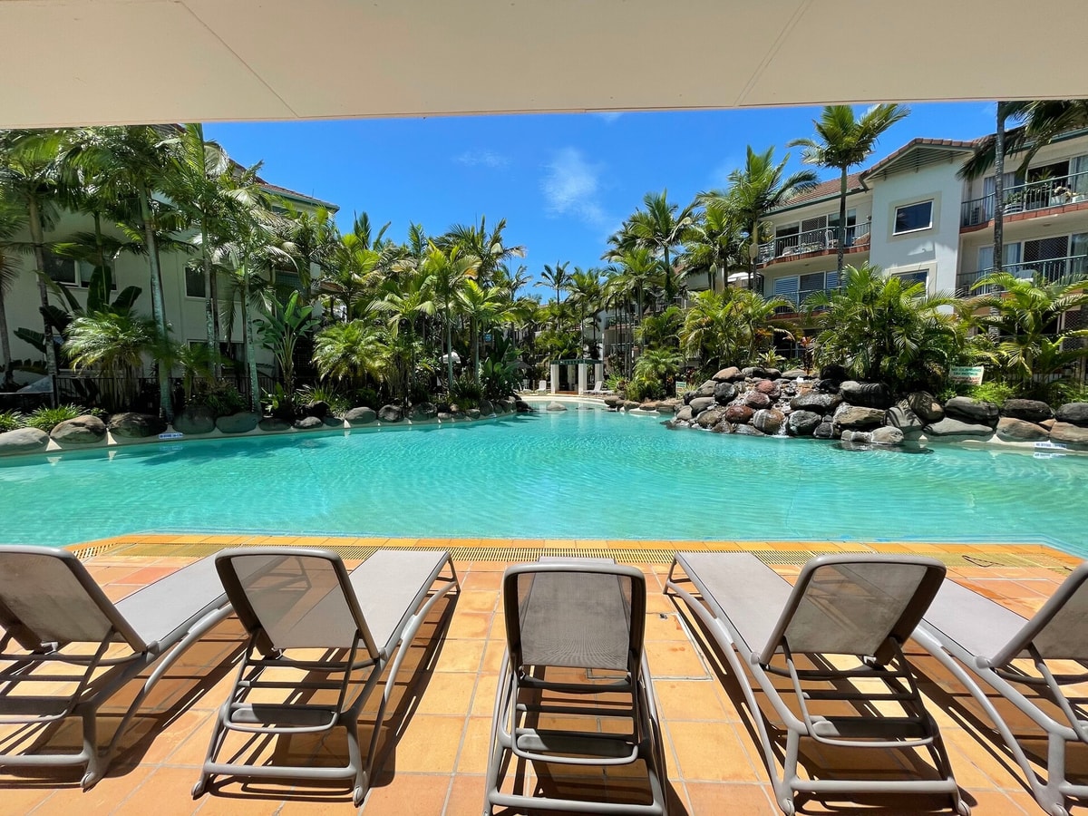 Step inside to find a bright, airy open-plan living and dining area, tastefully furnished for comfort and style. The fully equipped kitchen makes it easy to prepare meals at home, while the private balcony is ideal for enjoying your morning coffee or evening drinks overlooking the lush tropical gardens or sparkling lagoon pools. The master bedroom features a comfortable queen bed and ample storage, while the second bedroom is perfect for kids or friends. The apartment also includes a modern bathroom, internal laundry facilities, air conditioning (in the living area), and free WiFi for your convenience.